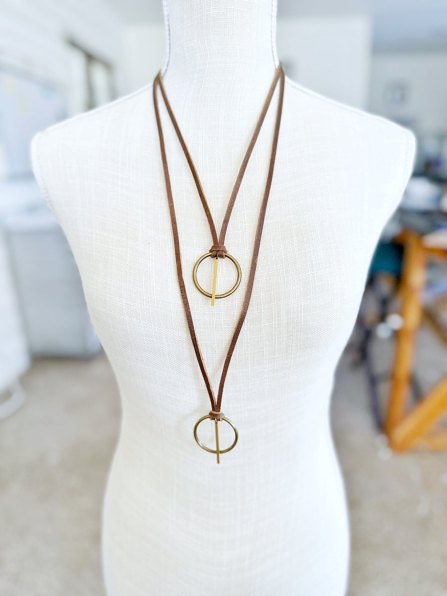 38mm Bronze O-Ring w/ Center Bar on 23" and 32" Taupe (cool) Brown Leather with lobster clasp 2" extenders.
